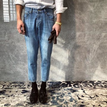 2025夏季新款韓版潮流男寬松小直筒褲休閑簡約牛仔褲哈倫褲九分褲