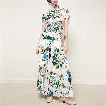 【米蘭精品】褶皺套裝休閒裙裝(兩件套)-三宅風印花短T百褶長裙女裝2色74ff25