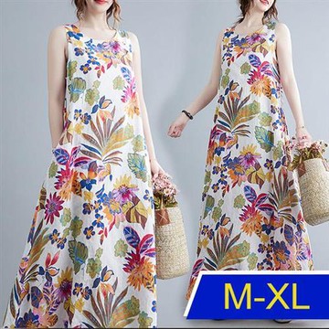 【韓國K.W.】繽紛花清爽系輕質棉麻無袖洋裝(涼感/連身裙/中長裙/長裙/輕薄/短袖)