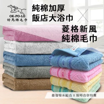 【OKPOLO】台灣製菱格純棉毛巾+純棉加厚飯店大浴巾-超值二件搭配(毛巾*4+浴巾*2)