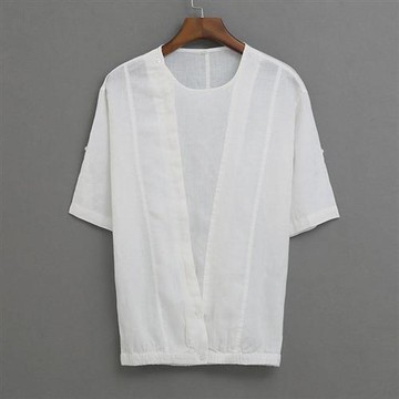 【米蘭精品】亞麻T恤短袖上衣-圓領假兩件寬鬆休閒男上衣2色74ev15