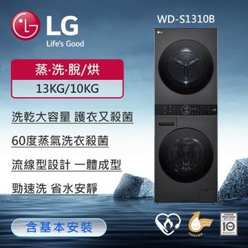 LG樂金 13公斤+10公斤WashTower AI Wi-Fi 智控洗乾衣機WD-S1310B含基本安裝
