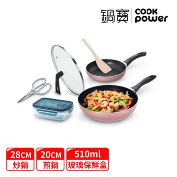 【CookPower鍋寶】金鑽不沾繽紛六件組(28炒+20煎+28蓋+木鏟+剪刀+510ml保鮮盒) (兩色任選)