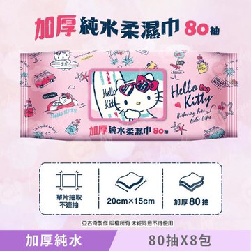 Hello Kitty 加厚超純水有蓋柔濕巾/濕紙巾 (加蓋) 80 抽 X 8 包 特選加厚縲縈水針布 超溫和配方無添加劑-慈濟專案