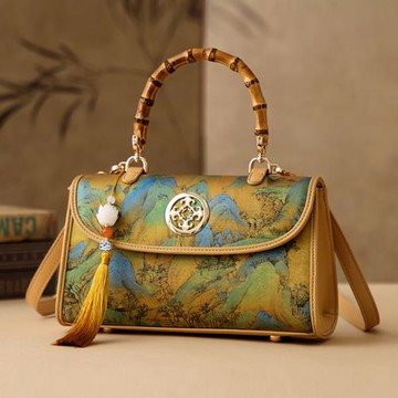 Sp house 山水百景圖精緻刺繡流蘇竹節 手提側肩包 斜背包(黃綠色)