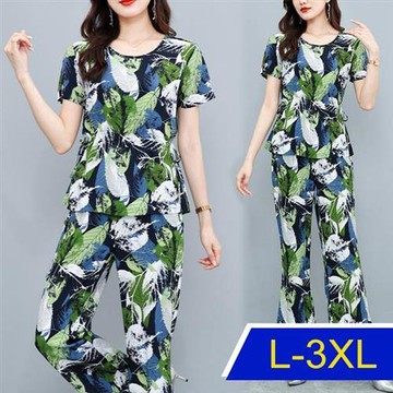 【韓國K.W.】韓國棉稠顯瘦藍白綠葉短袖套裝(涼感/外出套裝/短袖)