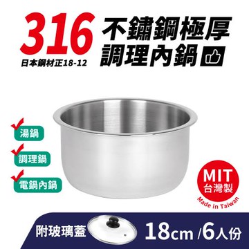 台灣製316不鏽鋼極厚調理內鍋6人份(18cm/1750ml)+18cm玻璃蓋組