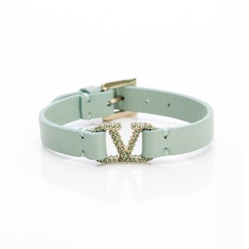 Valentino 金色鑲淺綠水鑽Vlogo皮革手環(青綠色)