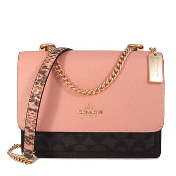 COACH KLARE 金馬車Logo咖啡X貝殼粉色鵝掀蓋滑鍊風琴斜背/兩用包