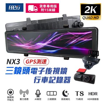 [任e行] NX3 2K 12吋 GPS 三鏡頭 行車記錄器 電子後視鏡 (前後+車內三錄影) 贈64G記憶卡