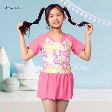 比基尼妮.艾沃拉鍊二件式裙短袖大童兒童泳衣(L-5L)