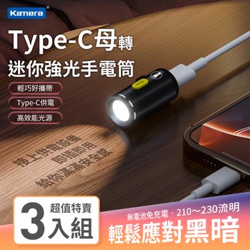 【Kamera 】迷你手電筒 USB-C接口 強光手電筒 1W 高亮度LED燈 TYPE C供電 無電池設計 即插即用 隨身手電筒 (3入組)