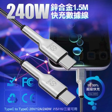 VOORCA 240W高效快充 Type-C to Type-C 鋅合金接頭 高密度48編混編線身 數據傳輸充電線 1.5M