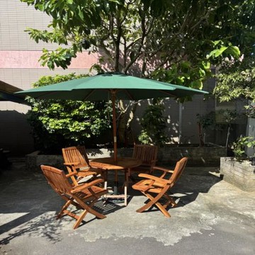 4尺公園桌+玫瑰公園椅二張+9尺木柄遮陽傘+專用傘座