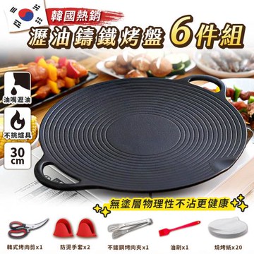 JOJOGO 韓國熱銷瀝油鑄鐵烤盤6件組 30cm 不沾烤盤 烤盤 露營 韓式烤盤 炒鍋 韓國烤盤 烤肉 中秋 鑄鐵