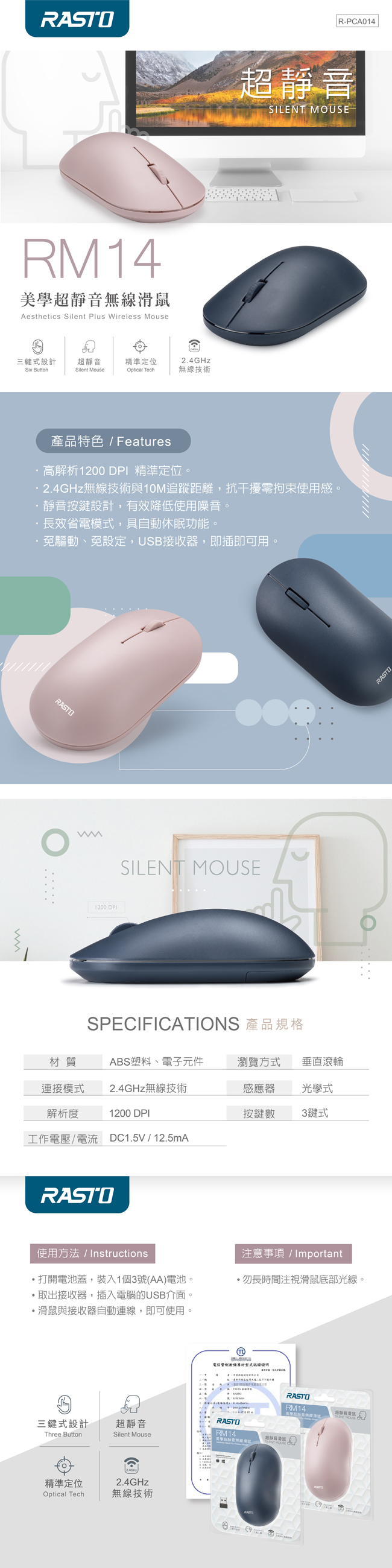 【RASTO】RM13 六鍵式超靜音無線滑鼠 兩色 無線滑鼠 靜音 省電 USB接口 原廠保固【JC科技】