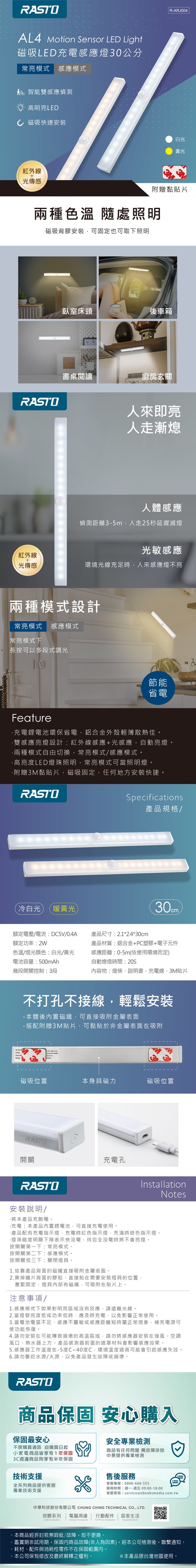 【廠商直送】RASTO-AL4磁吸LED充電感應燈30cm-多色任選