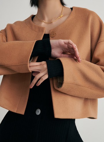 灰羊毛料立領半開拉鏈格紋套袖收下擺衛衣式上衣外套 杲果GAOGUO