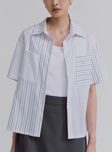 不對稱條紋拼接短袖襯衫