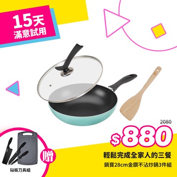 [好食光限定]鍋寶28cm金鑽不沾炒鍋3件組(蒂芬妮藍)+贈砧板刀具組