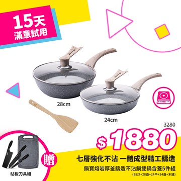 [好食光限定]鍋寶熔岩厚釜鑄造不沾鍋雙鍋附蓋5件組(28炒+28蓋+24平+24蓋+木鏟)+贈砧板刀具組