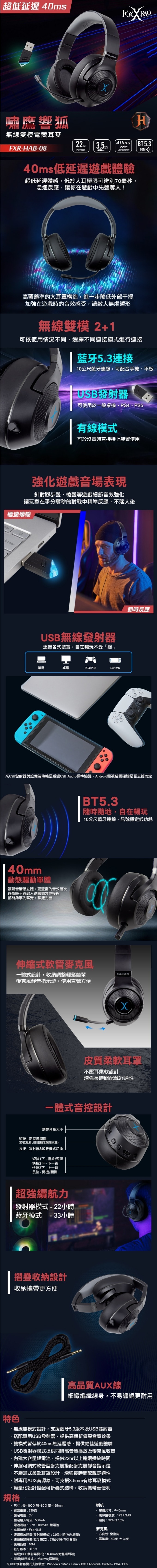 ※ 2.USB發射器模式之40ms延遲代表完整從發射器輸入至耳機端完整延遲;藍牙模式之延遲可能因連接之藍牙裝置而有不同效果。