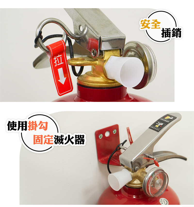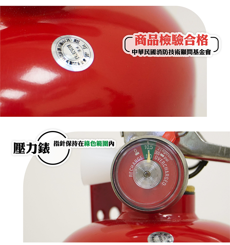 ◆產品維護方法.每三個月檢查壓力錶一次,指針應保持在綠色指示線上 ,如降至綠色指示線以下應重新加壓,保持正常狀況。.每二年加壓一次,使用過後應換裝藥劑,以確保滅火效能。.應掛於明顯易見處,適應溫度0℃~40℃(不可潮濕)