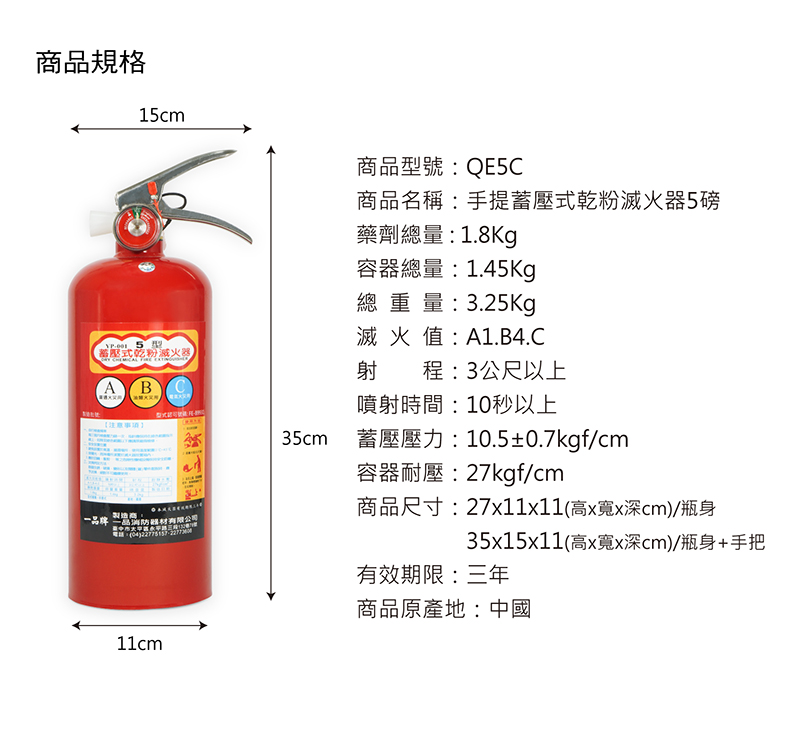 ◆產品規格.蓄壓式(附錶式).藥劑總量:1.8公斤.容器總量:1.45公斤.總重量:3.25公斤.尺吋:35(高)x15(寬)x11(深) /(公分).滅火值:A1.B4.C.射程:3公尺以上.時間:10秒以上.蓄壓壓力:10.5+_0.7kgf/cm.容器耐壓:27kgf/cm.有效期限:三年