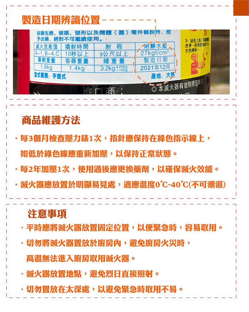 ◆使用時需注意事項.平時應將滅火器放置固定位置,以便緊急時,容易取用。.切勿將滅火器置放於廚房內,避免廚房火災時,高溫無法進入廚房取用滅火器。.滅火器放置地點,避免烈日直接照射。.切勿置放在太深處,以避免緊急時取用不易。