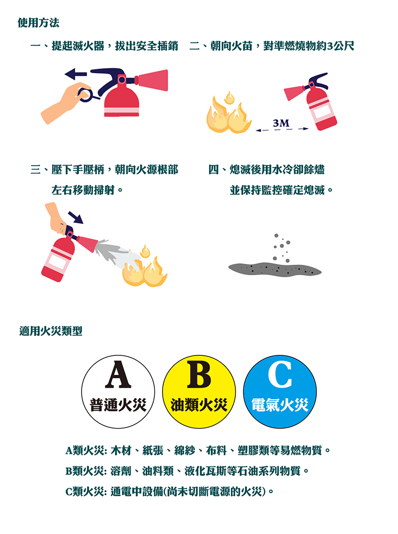 ◆使用方法步驟:一、提起滅火器,拔出保險插梢二、握住喇叭噴嘴前握把三、朝向火苗,對準燃燒物約3公尺四、壓下手壓柄,朝向火源根部噴左右移動掃射五、熄滅後用水冷卻餘燼並保持監控確定熄滅