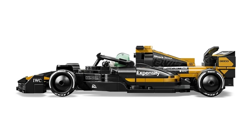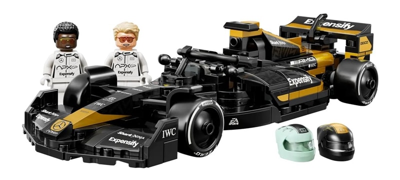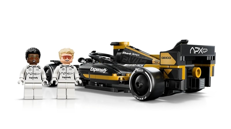這輛 F1 玩具賽車具備電影車款的設計細節,包括黑色與金色的車身塗裝、贊助商貼紙,以及印有「Pirelli」字樣的寬大後輪胎。此賽車盒組還配有 2 隻出自電影的 F1 賽車手角色人偶:桑尼海耶斯和喬許皮爾斯,兩人均配有印了個人簽名的頭盔、假髮和扳手,扳手也可用來貼貼紙和拆開積木。