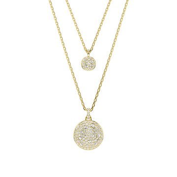這款閃爍的層次鏈墜是讓您展現耀眼風格的理想選擇。鍍金色調設計搭配兩條鏈條,每條鏈條圓頂均飾有流星圖案,並搭配不同尺寸的雪花密鑲透明圓形 Swarovski 水晶,精美絕倫。要展現更百搭的風格,可以翻轉鏈墜,露出較大圖案周圍的 Swarovski 水晶光環,以及較小圖案中央的單顆 Swarovski 水晶。
