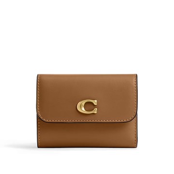 COACH 古銅金C字LOGO皮革搭帆布內裡三折扣式短夾(蜂蜜棕)