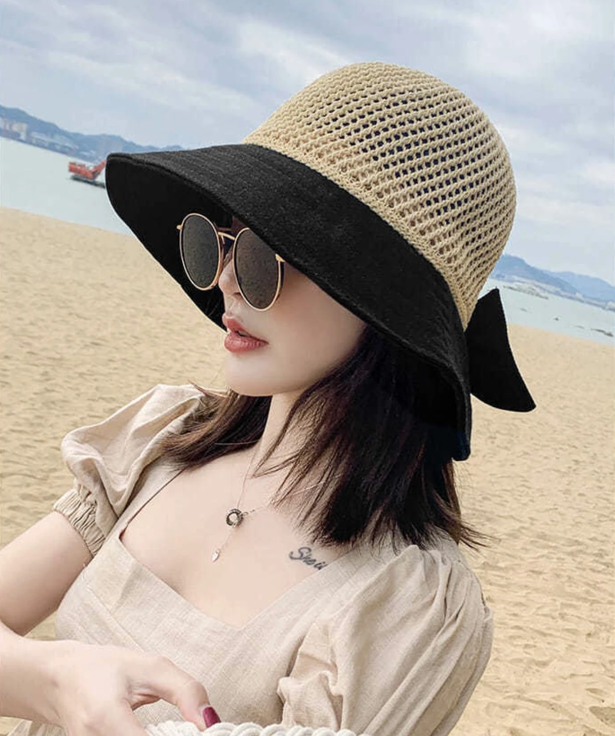 晚晚林小宅同款拉菲草帽女夏天小清新韓版遮陽沙灘帽毛邊綁帶帽子1入