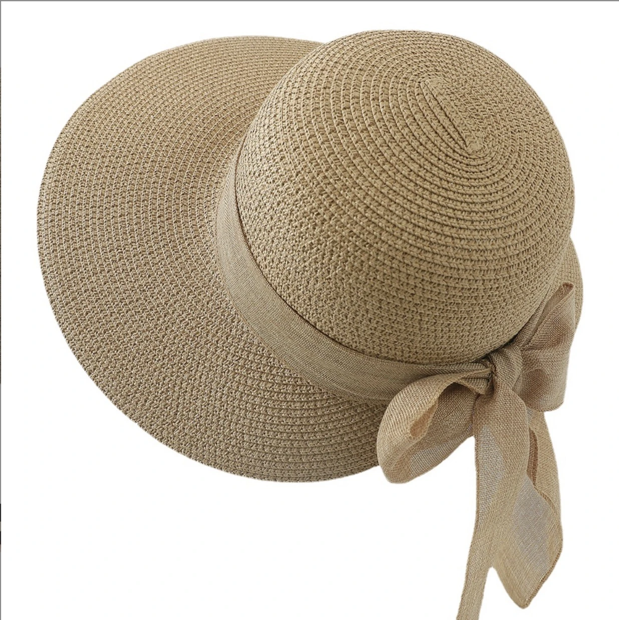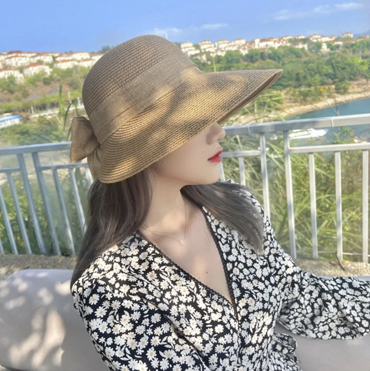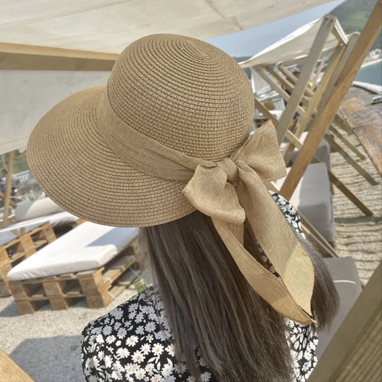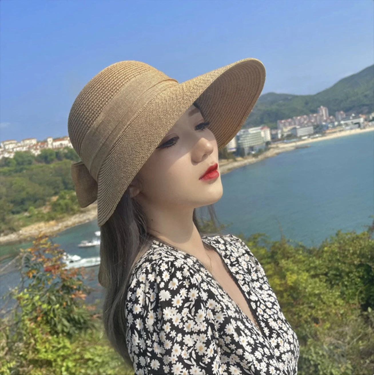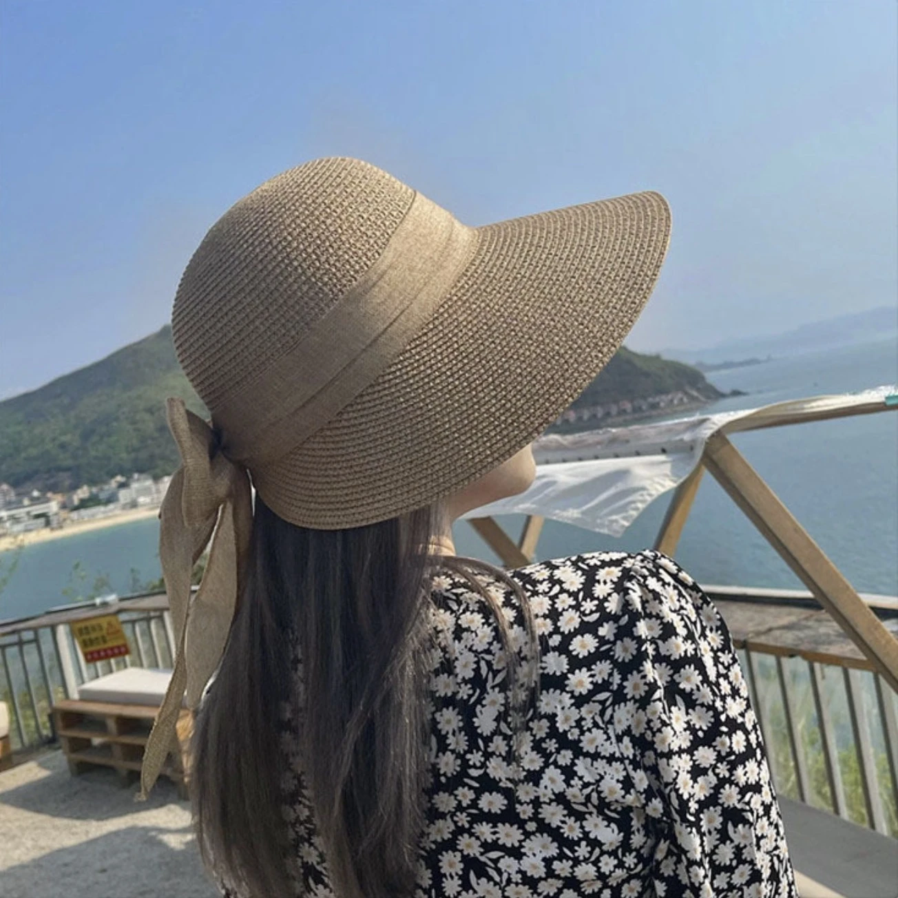 大沿夏季度假拍照麥稈草系帶編織大帽檐平頂沙灘草帽遮陽帽女防曬