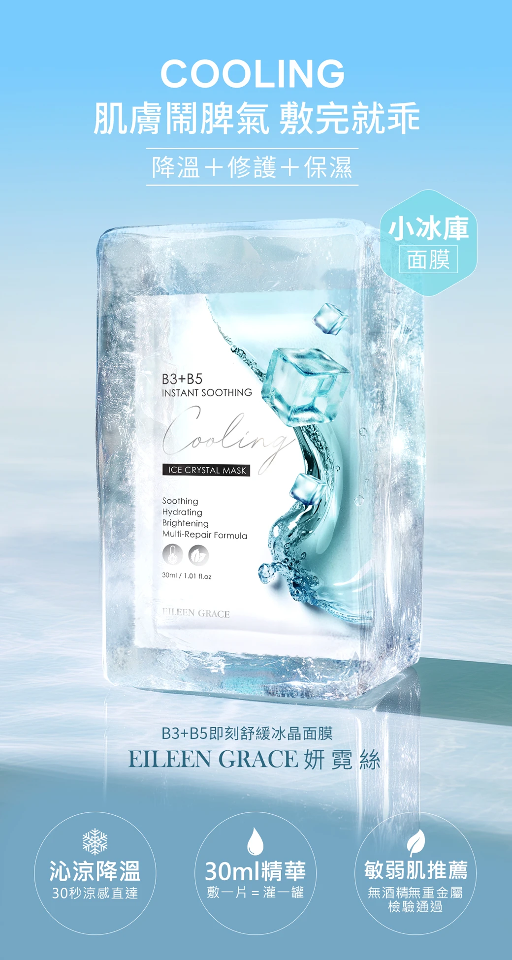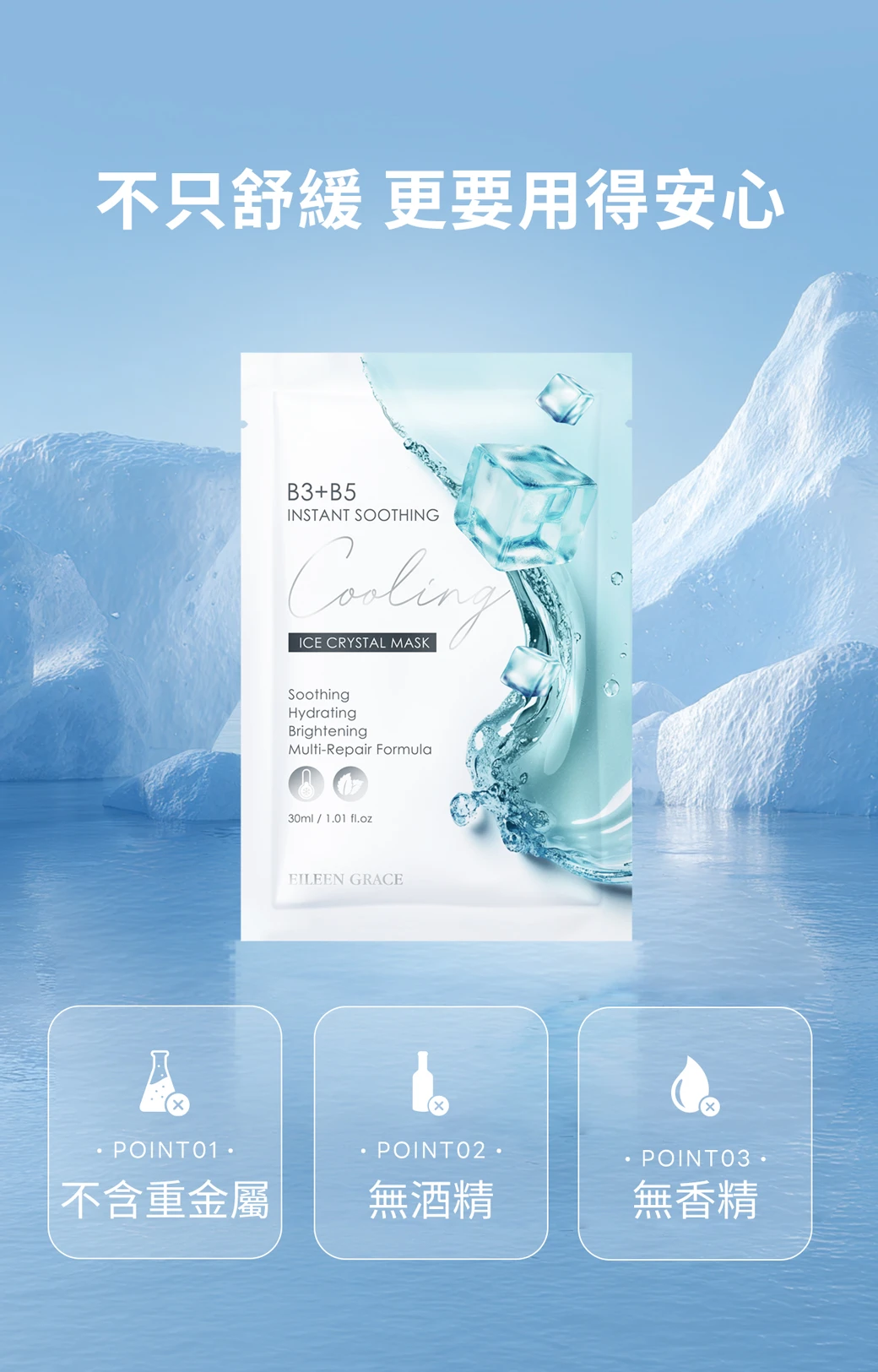 名字叫「冰晶」,敷起來會很冰嗎?質地冰涼舒適,不含酒精、不刺激,屬於柔和降溫感。不會有刺痛感喔。