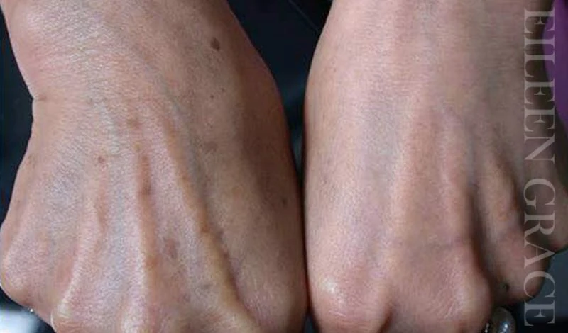 這是一個打高爾夫球的貴婦手,因為長期只有帶一隻手套,所以另一隻手長出了老人斑與皺紋,防曬是否能真的做到足,絕對是老化的關鍵因素之一。