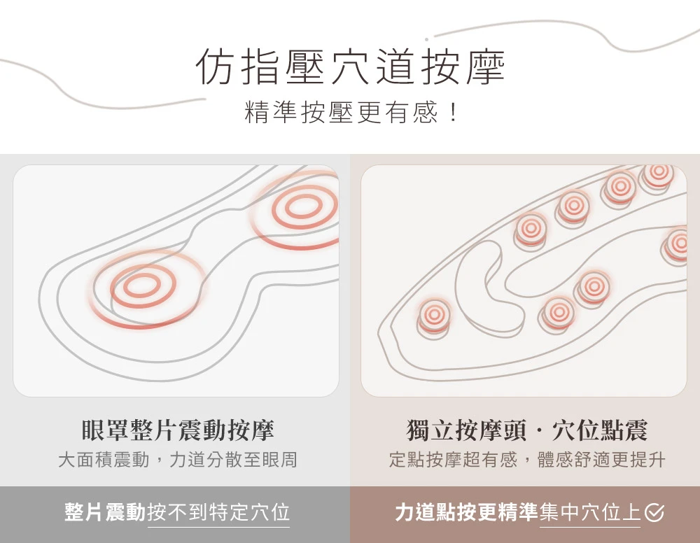 點震按摩是通過精準高頻震動仿人手按摩穴道,針對眼周特定重要穴道加強按壓,長時間戴隱形眼鏡、需要眼睛保養及睡眠品質差的人,可體驗精準到位,舒爽感十足的點震式按摩眼罩,再也不會覺得眼睛按摩只是隔靴搔癢!