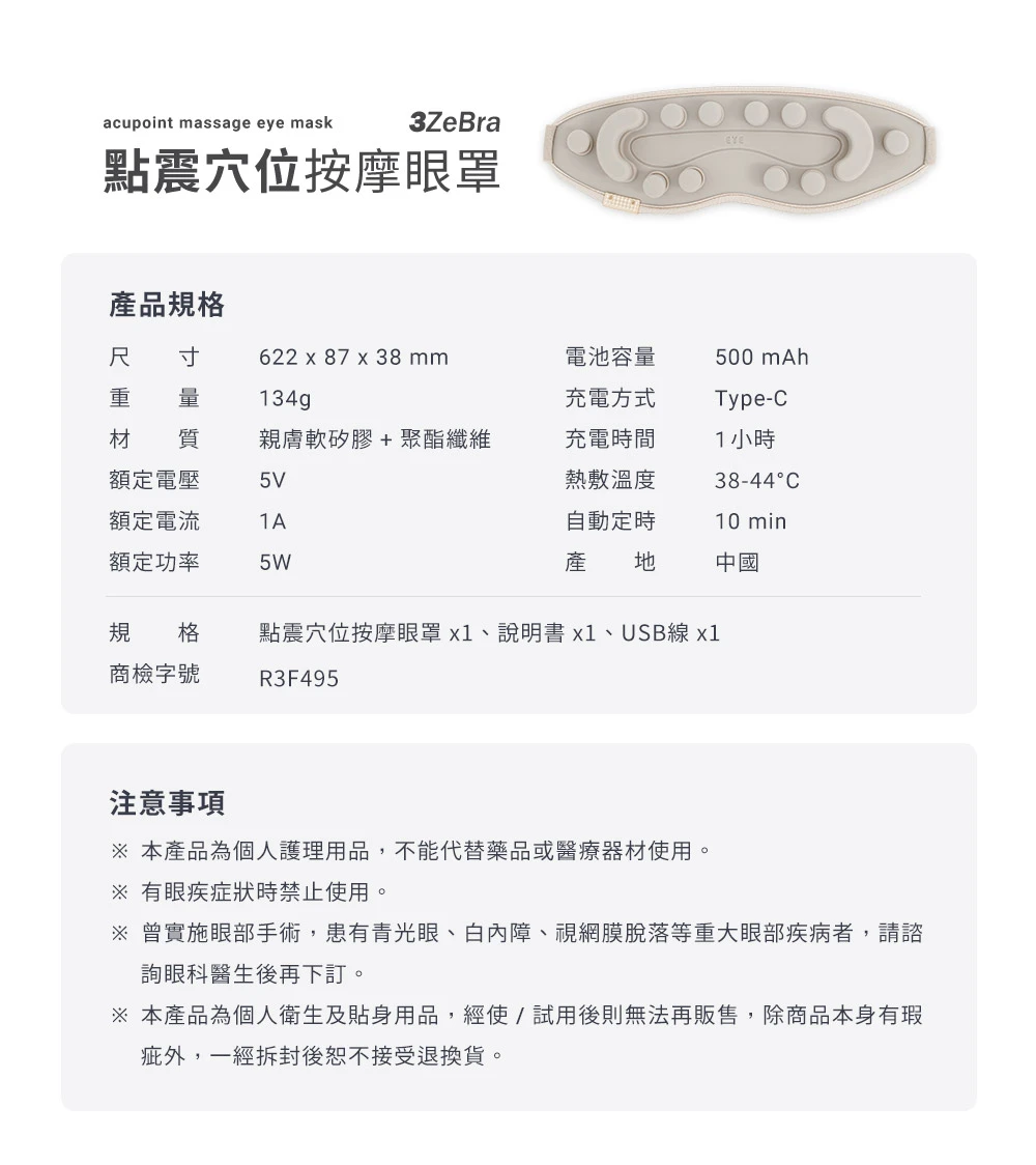 規 格 點震眼罩x1、充電線x1、說明書