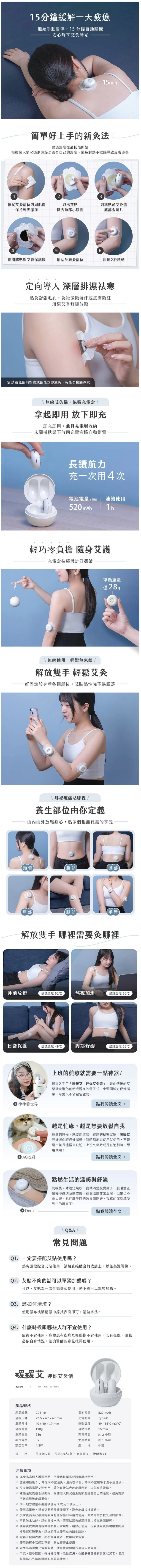 規 格 艾灸儀(2顆)、艾貼(30入 / 盒)、充電線 x1、說明書