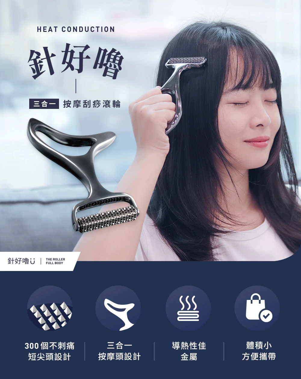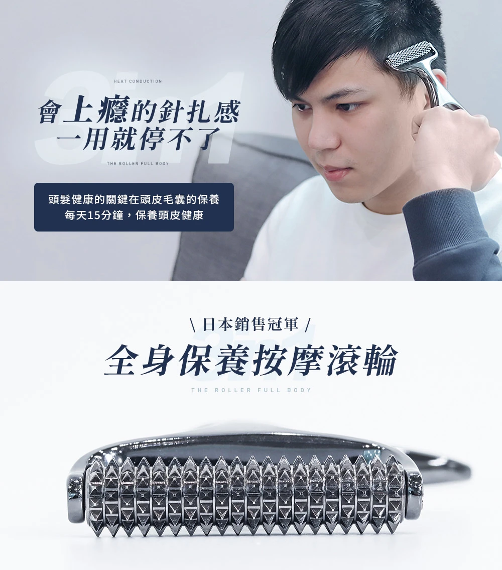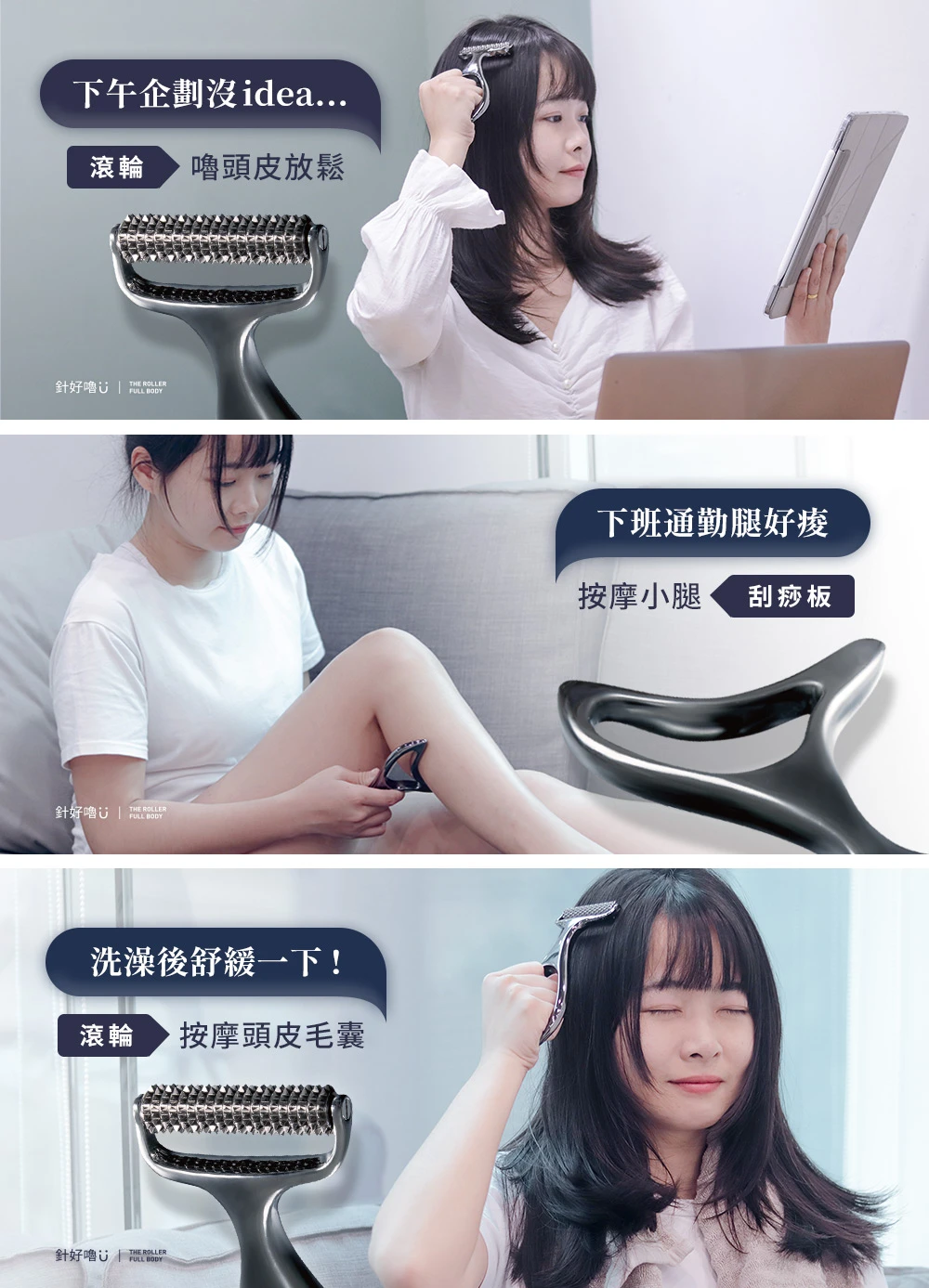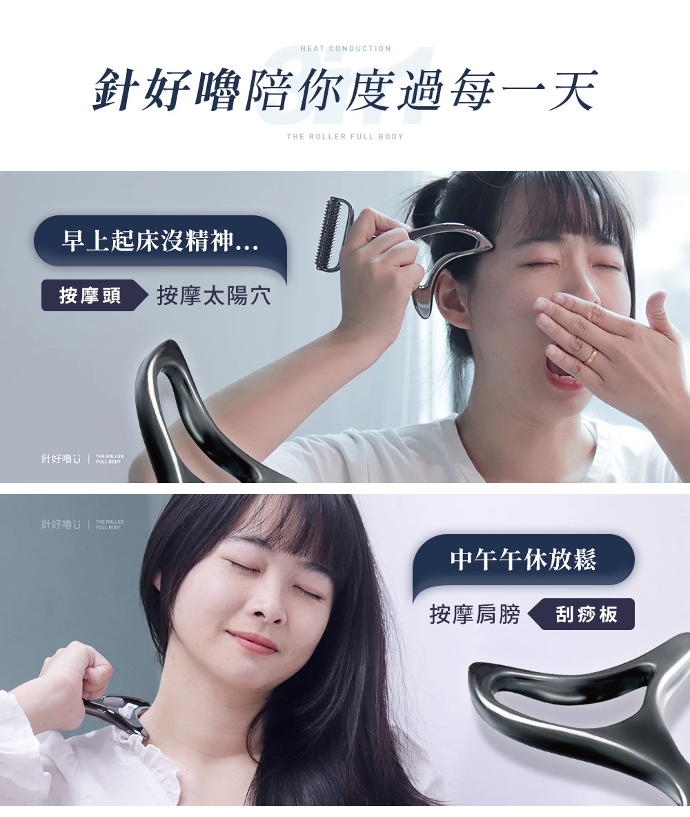 日本首創【針好嚕 ∣ 三合一 按摩刮痧滾輪】結合頭皮及身體按摩,專為解決現代人日常對舒壓放鬆身體日益增高的需求,在家就能享受舒適的按摩感受!
