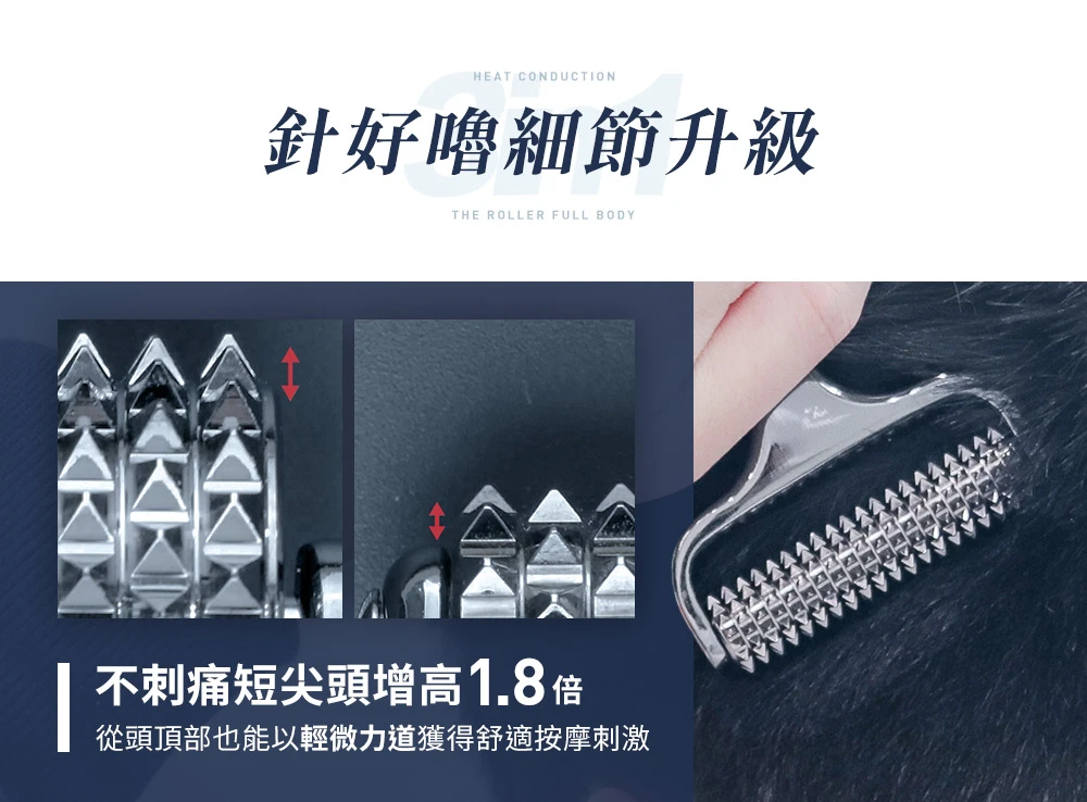 不刺痛短尖頭增高 1.8 倍:就算從頭頂以輕微力道按摩也能獲得按摩刺激,按摩尖頭增高不會受到頭髮厚薄度而讓按摩效果打折扣。