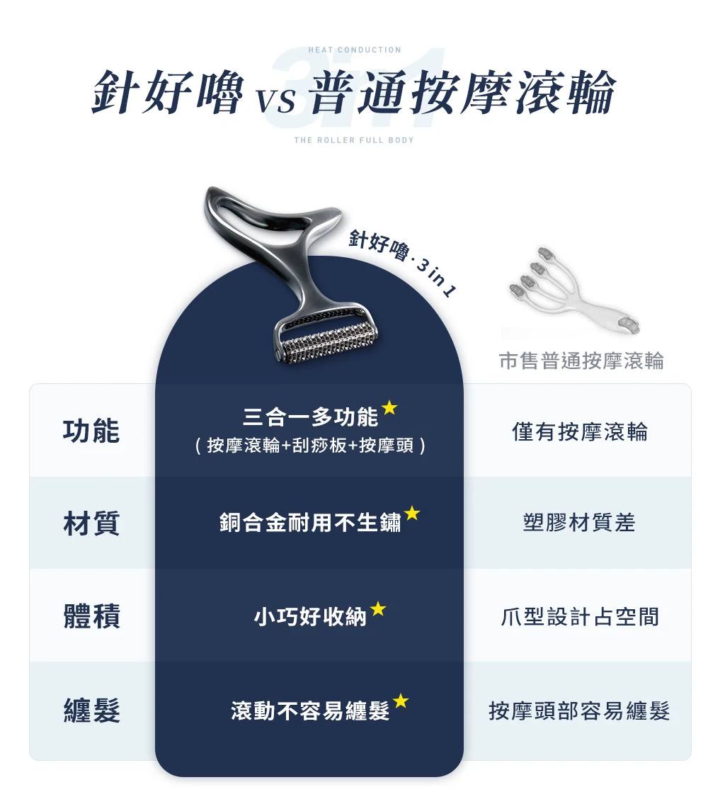 傳統的刮痧板不僅不容易上手,還要承受過程中的疼痛…【針好嚕 ∣ 三合一 按摩刮痧滾輪】貼合人體曲線的刮痧板設計,使用輕微力道按摩就能達到放鬆效果。
