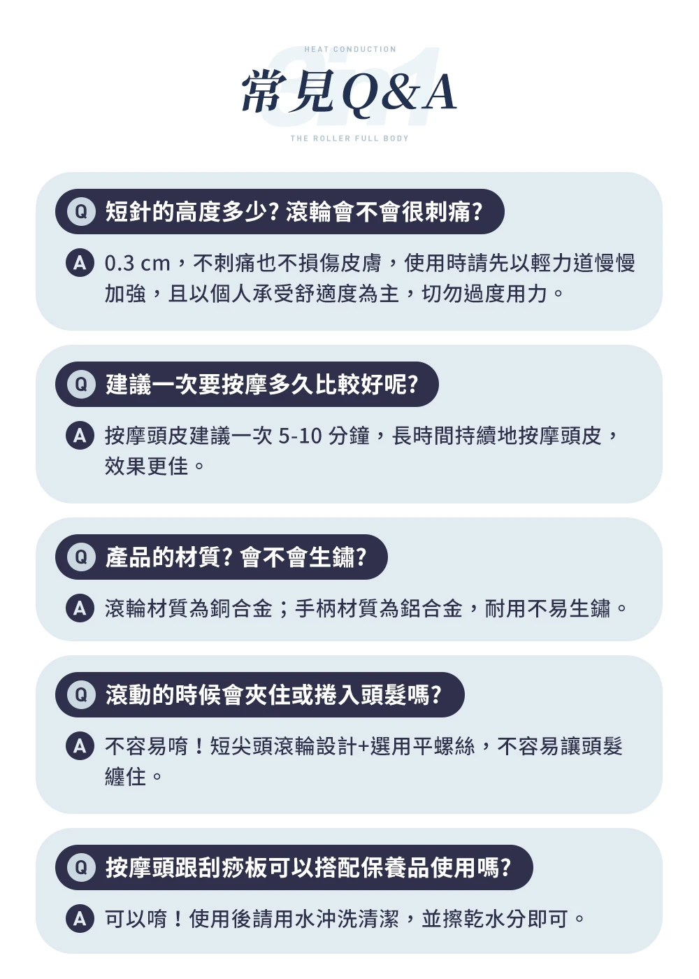【使用注意事項】由於結構原因,滾動可能會產生摩擦噪音。/對金屬過敏或有其他過敏症、內出血的體質者請勿使用。/如果您懷孕、頭皮有異常、正在服用治療內臟疾病的藥物或激素,使用前請先諮詢醫生。/本商品無醫療效果。/開始使用時請慢慢徐緩使用,如果您在使用過程中或使用後感到任何疼痛或不適,請立即停止使用。/每個人的使用感受有所差異,請小心使用,切勿用力過猛導致受傷。/請不要在同一個地方連續使用,避免導致頭皮發紅等問題。/如果您在浴缸中使用它,使用後請將水分擦乾並使其完全乾燥,否則可能導致生鏽。/使用後,請擦去污垢再存放。如果主體被腐蝕或生鏽,請停止使用。/本商品表面較滑,浸濕使用時請小心。/請不要觸摸高溫發熱或靠近火的那一端。/存放時,請避免陽光直射、高溫多濕,並置於兒童接觸不到的地方。/請不要在室外使用。