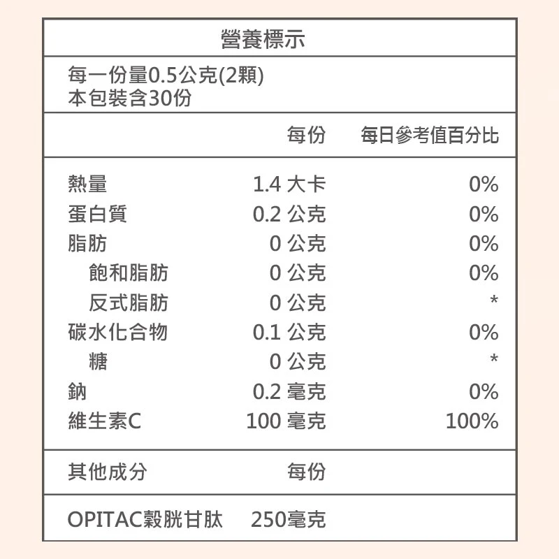 *自2025年8月起製造之穀胱甘肽膠囊,為延長內含維他命C之活性,全面改為白色膠囊。一樣不受胃酸溶解,直抵腸道吸收