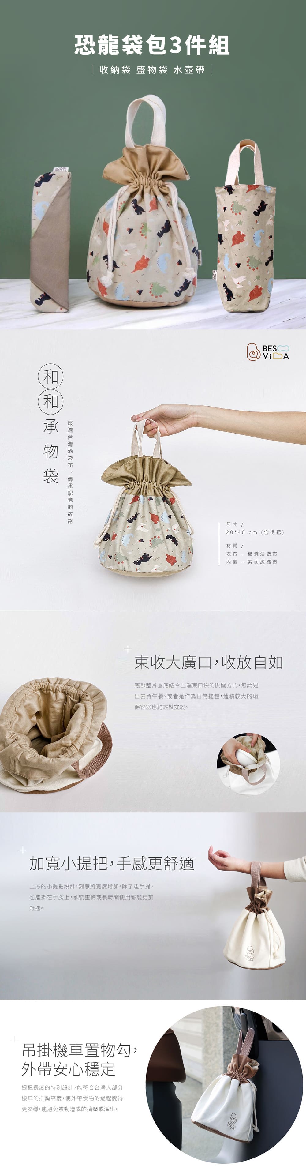 內裏:素面純棉布 - 尺寸: 承物袋20x40cm(含提把) 收納袋23x6.5cm 水壺袋15*32cm