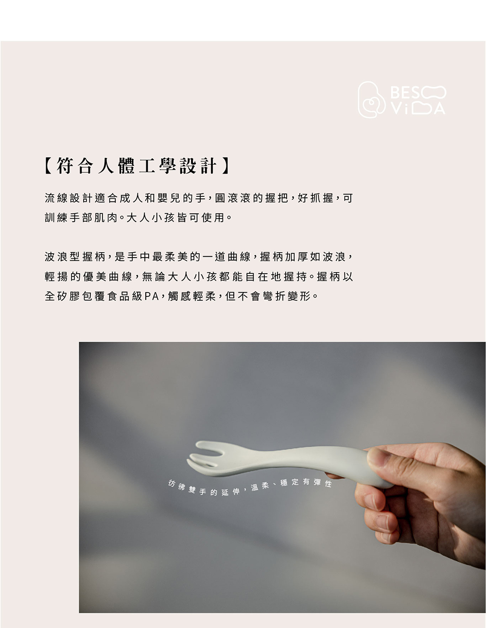 - 矽膠餐具:食品級抗菌矽膠、食品級 PA
