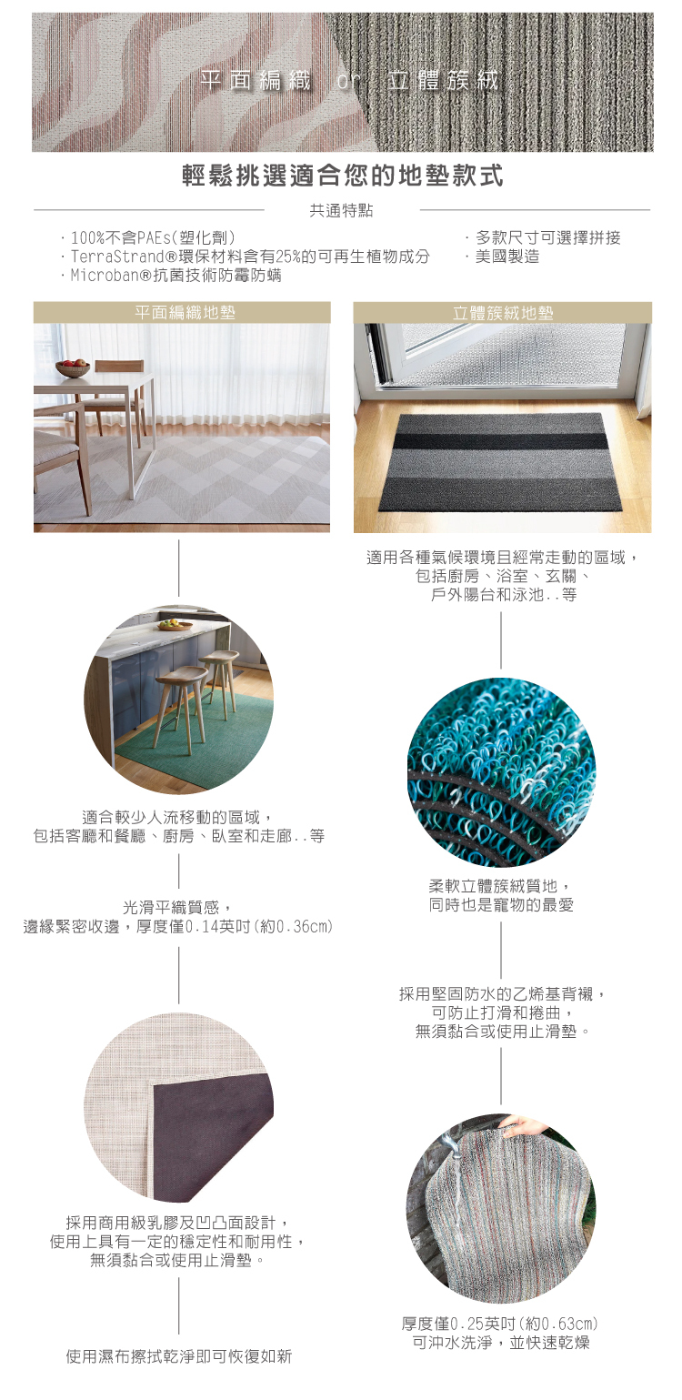 .當使用於粗糙表面時,乳膠背襯有可能會磨損。這不影響表面地墊的編織設計或其性能,建議底部可以再放一層隔離墊來防止磨損。