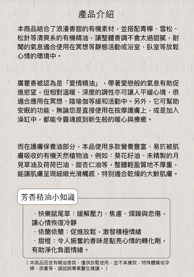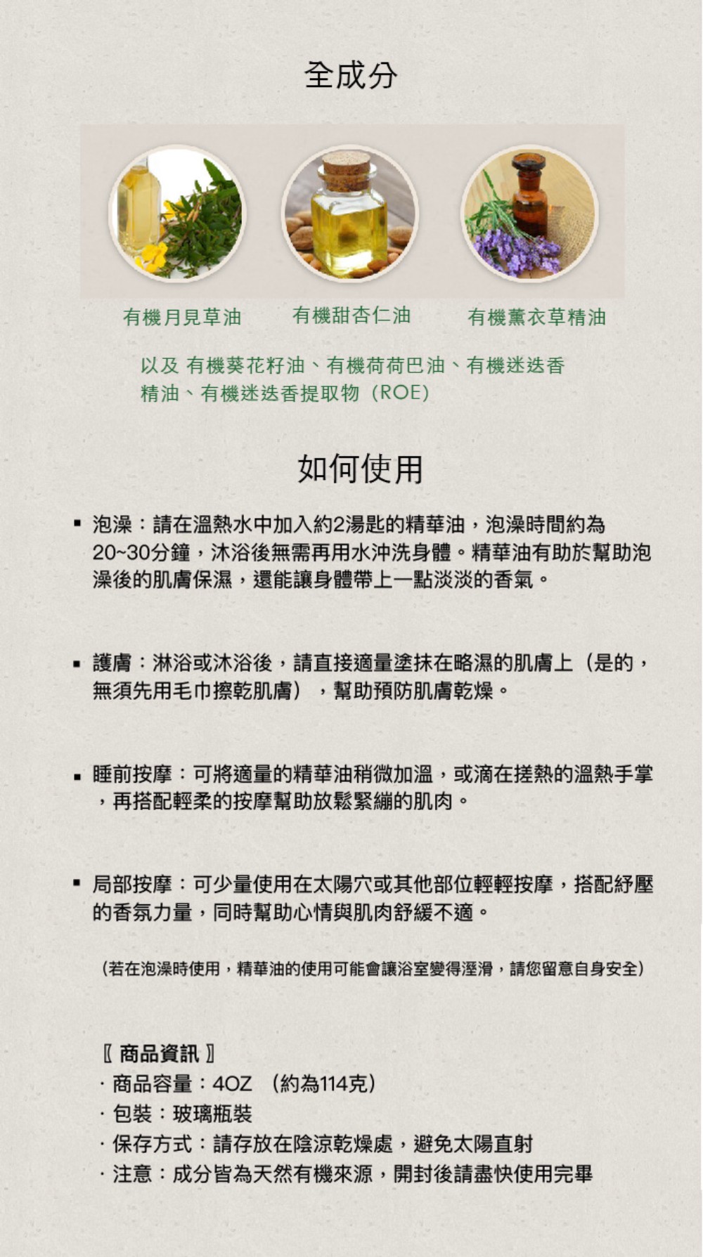✤ 洗澡後直接塗抹在半乾的肌膚上,可搭配輕柔按摩幫助身體放鬆