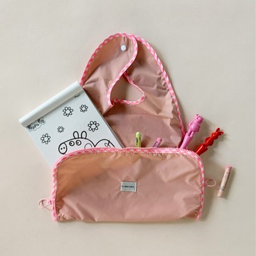 兩頭三邊的彈性化拉鍊設計, 也讓承接食物的大口袋可以依照媽咪與兒童的需求做調整. 不僅是兒童學習用餐的好幫手, 更是兒童未來上學的餐具袋/ 媽咪的收納袋. 整面攤開後的圍兜加長了長度, 還能給長大後的寶寶當學畫畫/ 學烹飪用.